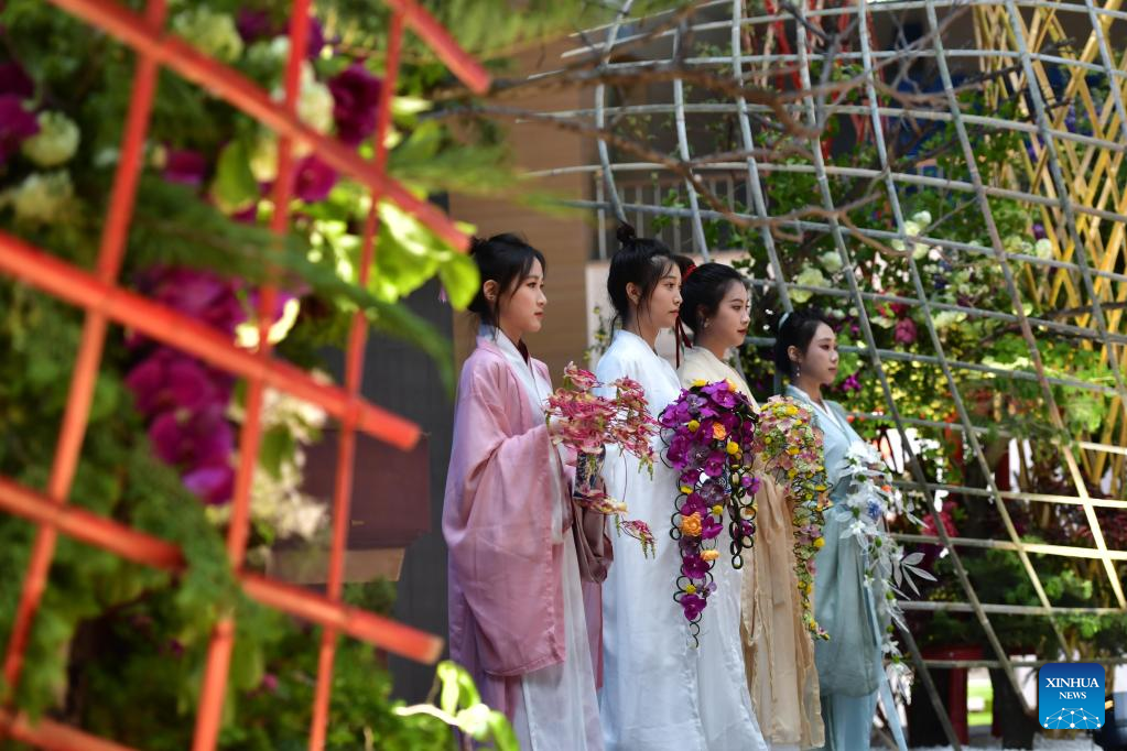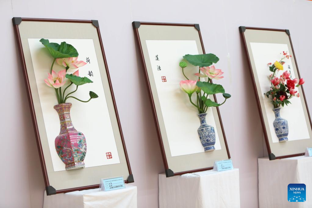 Students from the Liaoning Agricultural Technical College demonstrate flower arrangement artworks in Shenyang, northeast China's Liaoning Province, May 10, 2023. Teachers and professionals in gardening and floriculture presented flower arrangement artworks at the Liaoning Agricultural Technical College on Wednesday. (Xinhua/Yang Qing)