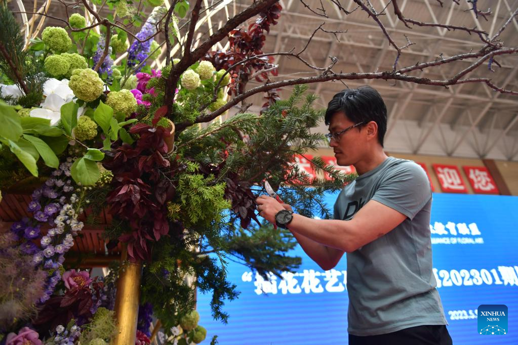A staff member makes preparations for flower arrangement artworks at the Liaoning Agricultural Technical College in Shenyang, northeast China's Liaoning Province, May 10, 2023. Teachers and professionals in gardening and floriculture presented flower arrangement artworks at the Liaoning Agricultural Technical College on Wednesday. (Xinhua/Chen Wei)