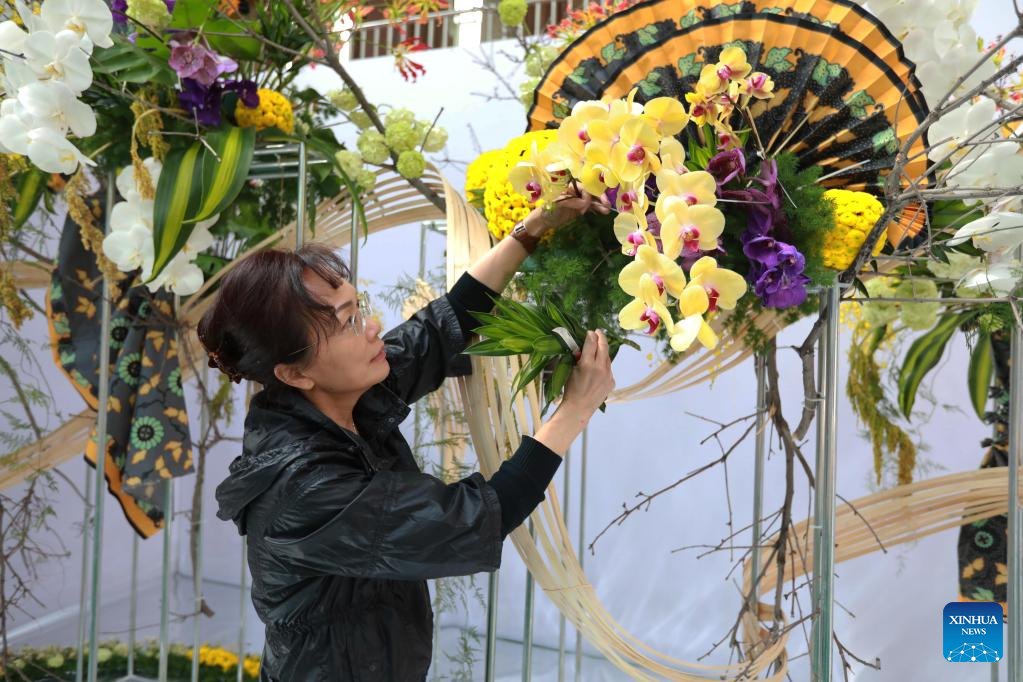 A staff member makes preparations for flower arrangement artworks at the Liaoning Agricultural Technical College in Shenyang, northeast China's Liaoning Province, May 10, 2023. Teachers and professionals in gardening and floriculture presented flower arrangement artworks at the Liaoning Agricultural Technical College on Wednesday. (Xinhua/Yang Qing)
