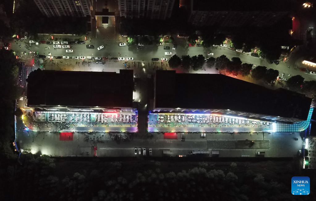 This aerial photo taken on May 8, 2023 shows people enjoying Zibo-style barbecue cuisine in Zhangdian District of Zibo, east China's Shandong Province. (Xinhua/Xu Suhui)