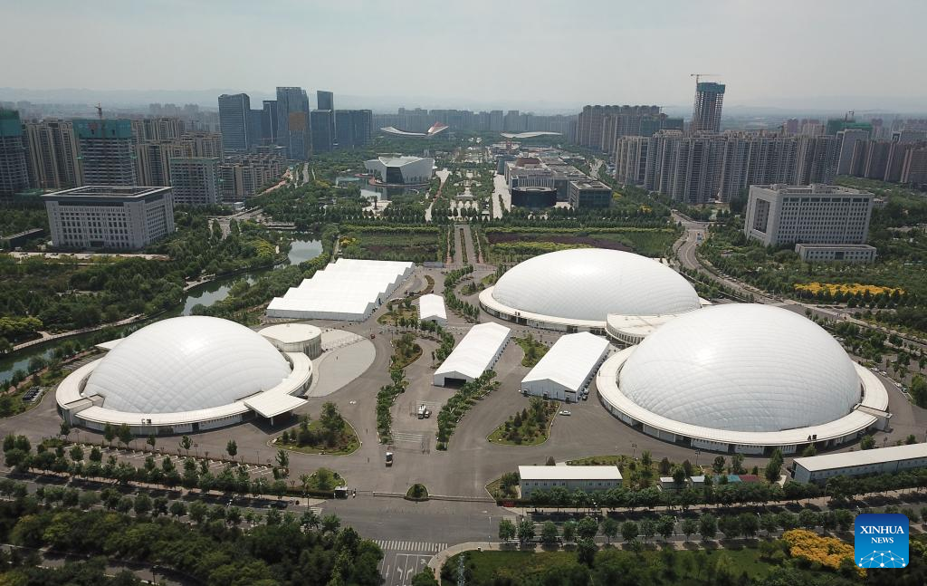 This aerial photo taken on May 8, 2023 shows a view of the Zibo Convention and Exhibition Center in Zhangdian District of Zibo, east China's Shandong Province. (Xinhua/Xu Suhui)