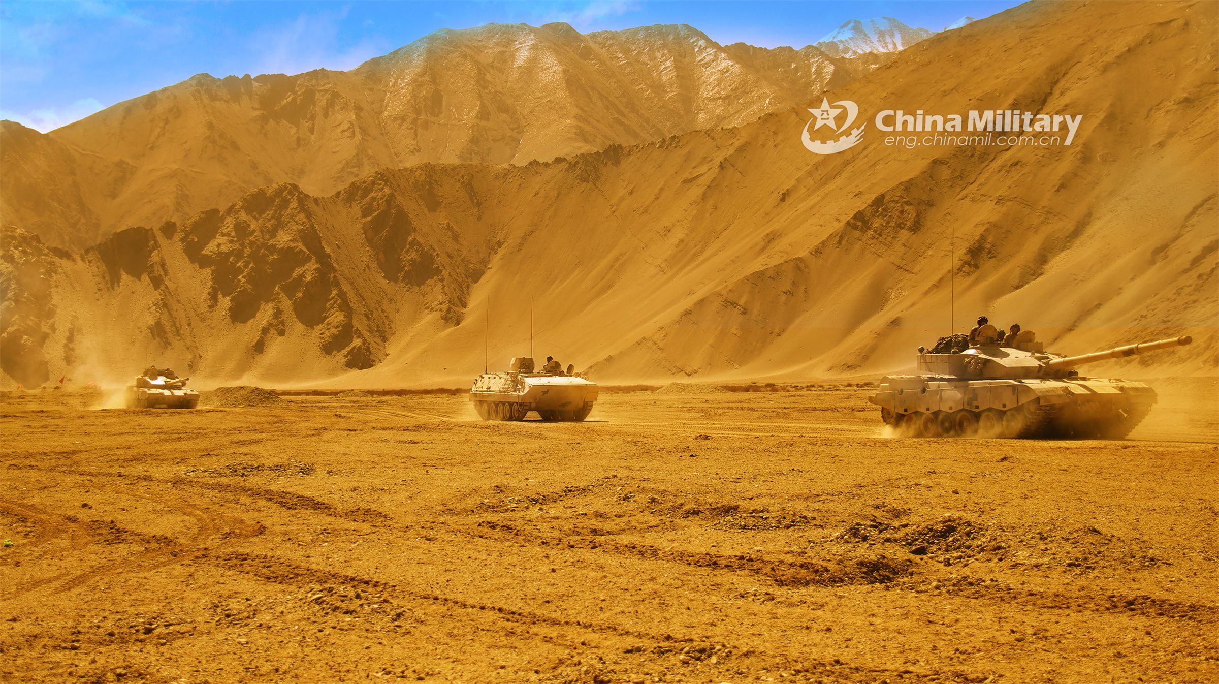 Armored vehicles attached to a brigade under the PLA 77th Group Army kick up plumes of dust as they move forward to designated operating base during a maneuvering operation in northwest China's Gobi desert in early May, 2023. (eng.chinamil.com.cn/Photo by Xie Yongpeng)