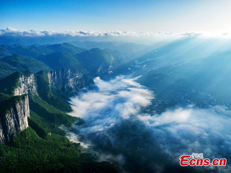 Dense clouds fill the Enshi Grand Canyon in central China's Hubei Province. The Enshi Grand Canyon is a typical karst landscape, with cliffs, caves, rock pillars, subsurface streams and waterfalls. (Photo: China News Service/Zhang Yuanming)