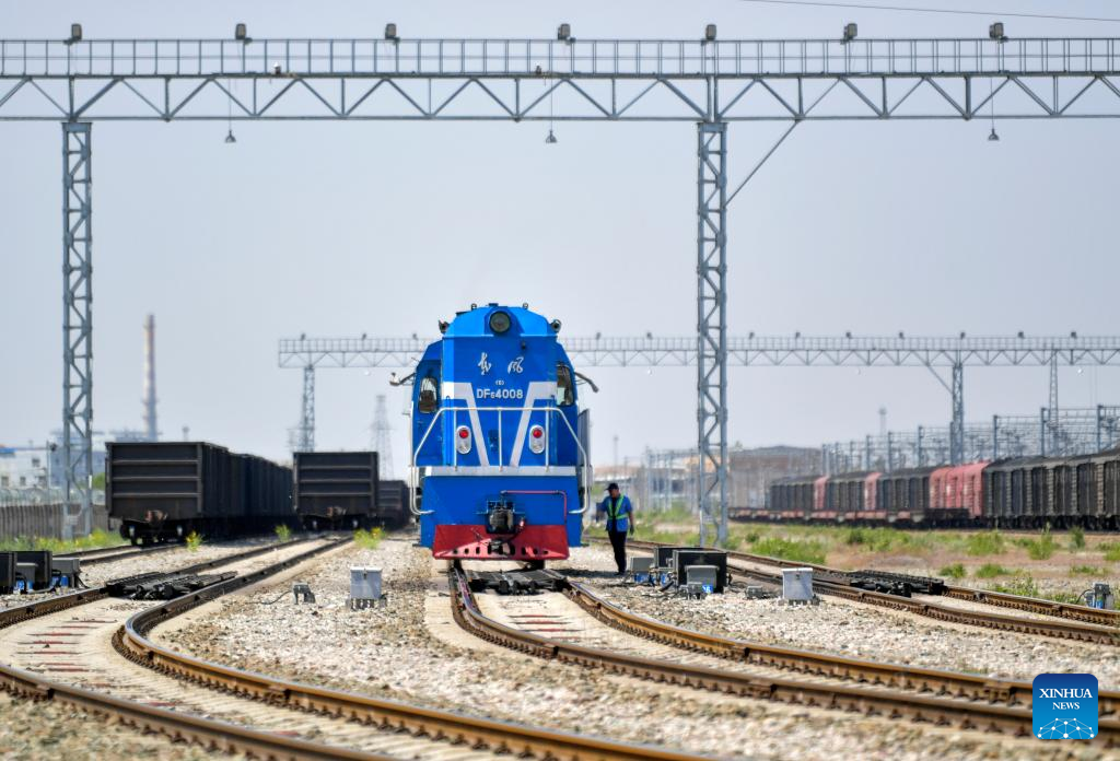 A staff member inspects a locomotive in a hump yard of a railway port in Horgos, northwest China's Xinjiang Uygur Autonomous Region, May 11, 2023. (Xinhua/Wang Fei)