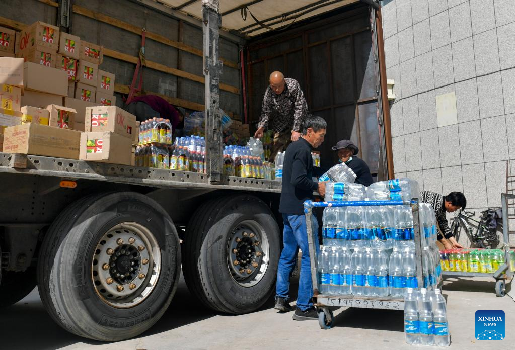 Workers unload imported foods from an inbound truck at a warehouse in Horgos, northwest China's Xinjiang Uygur Autonomous Region, May 8, 2023. (Xinhua/Wang Fei)