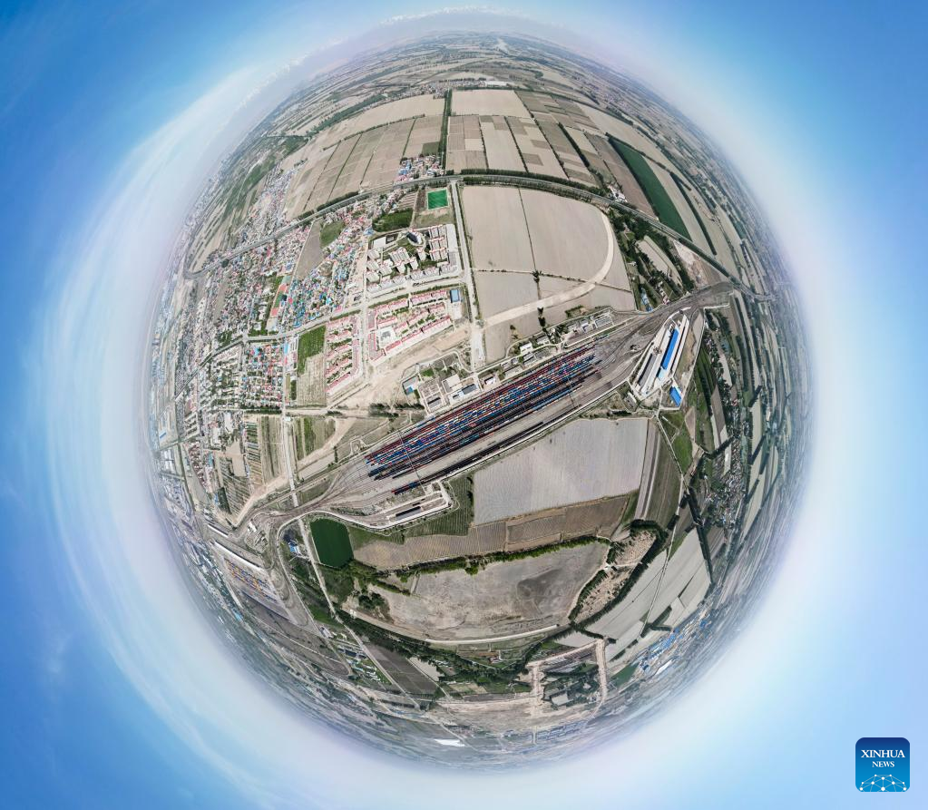 This aerial panoramic photo taken on May 11, 2023 shows a hump yard of a railway port in Horgos, northwest China's Xinjiang Uygur Autonomous Region. (Xinhua/Hao Zhao)
