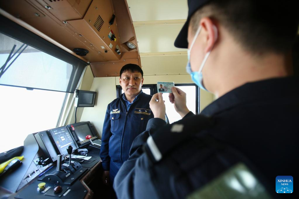 A police officer of the frontier inspection department of Horgos checks the credential of a train driver at a railway port in Horgos, northwest China's Xinjiang Uygur Autonomous Region, May 7, 2023. (Xinhua/Hao Zhao)