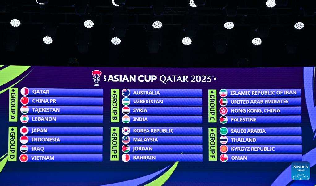 A screen displays the draw result during the draw ceremony for the 2023 AFC Asian cup championship held in Doha, Qatar on May 11, 2023. (Photo by Nikku/Xinhua)