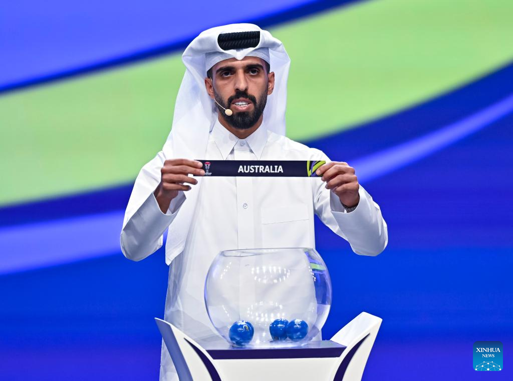 Qatari footballer Hassan al-Haydos displays the slip of team Australia during the draw ceremony for the 2023 AFC Asian cup championship held in Doha, Qatar on May 11, 2023. (Photo by Nikku/Xinhua)
