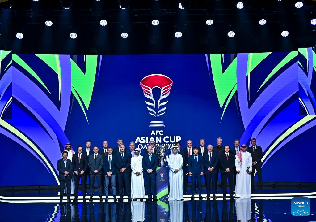FIFA President Gianni Infantino (centre L) and President of the Asian Football Confederation (AFC) Sheikh Salman Bin Ibrahim al-Khalifa (centre R) pose for group photos during the draw ceremony for the 2023 AFC Asian cup championship held in Doha, Qatar on May 11, 2023. (Photo by Nikku/Xinhua)