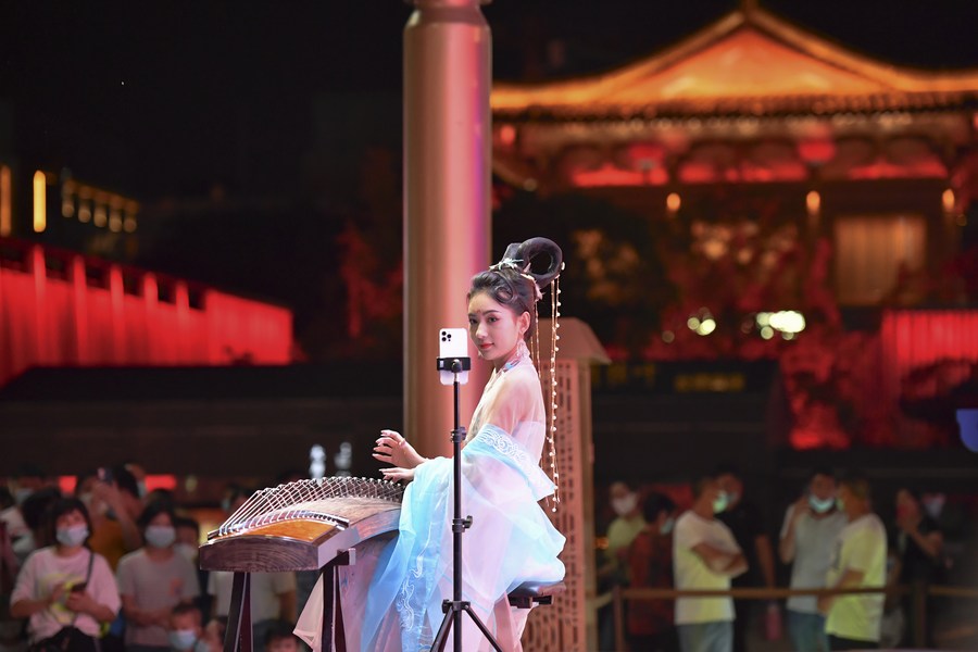 An actress performs at the Datang Everbright City scenic area in Xi'an, northwest China's Shaanxi Province, July 18, 2022. (Xinhua/Shao Rui)■