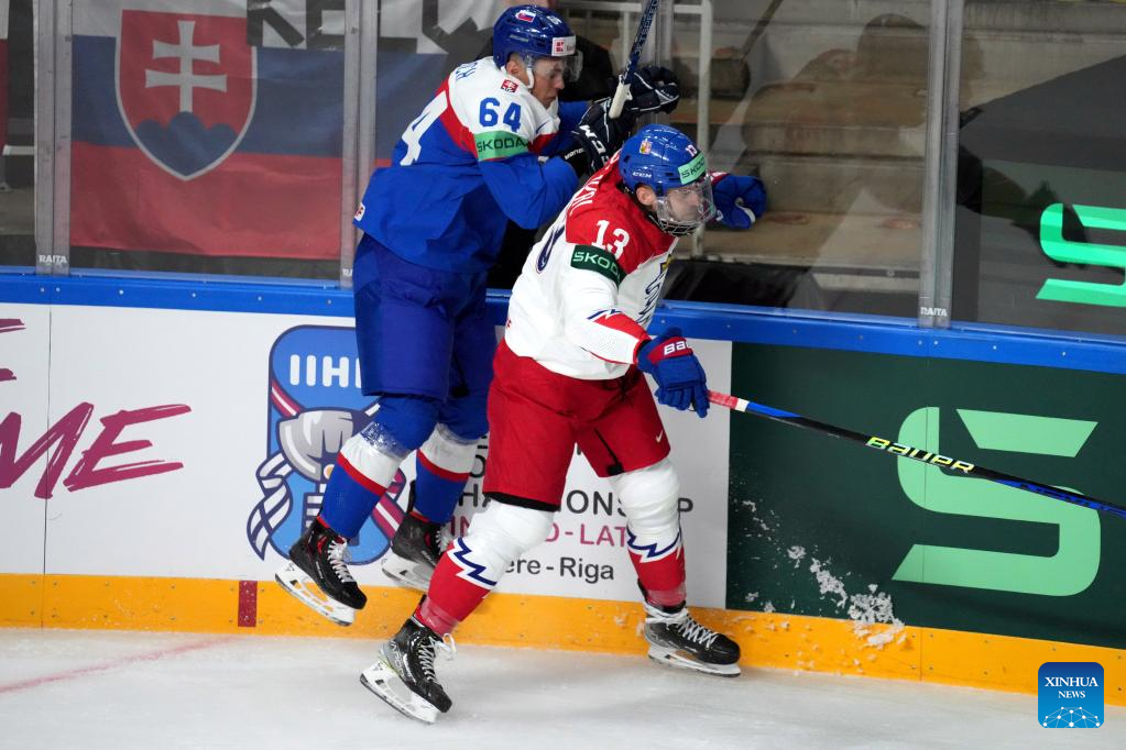 The Czech Republic's Jiri Smejkal (R) vies with Slovakia's Patrik Koch during the Group B match between the Czech Republic and Slovakia at the 2023 IIHF Ice Hockey World Championship in Riga, Latvia, May 12, 2023. (Photo by Edijs Palens/Xinhua)