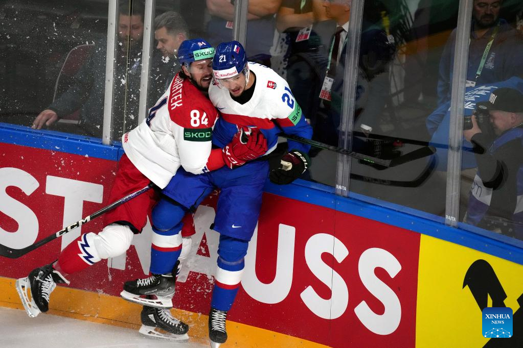 The Czech Republic's Tomas Kundratek (L) vies with Slovakia's Milos Kelemen during the Group B match between the Czech Republic and Slovakia at the 2023 IIHF Ice Hockey World Championship in Riga, Latvia, May 12, 2023. (Photo by Edijs Palens/Xinhua)