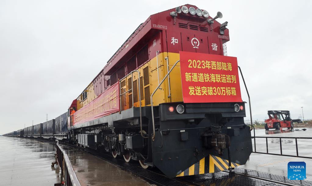 A train, loaded with goods from ASEAN countries, departs from a railway container distribution center in Qinzhou City, south China's Guangxi Zhuang Autonomous Region, May 11, 2023. This train will arrive at Tuanjiecun Station in southwest China's Chongqing three days later, suggesting over 300,000 TEUs have been transported this year through the New International Land-Sea Trade Corridor. With boosts from the Regional Comprehensive Economic Partnership (RCEP) and the Belt and Road Initiative (BRI), the New International Land-Sea Trade Corridor saw over 300,000 twenty-foot equivalent units (TEUs), an increase of 14 percent year-on-year, being transported by the rail-sea intermodal freight trains this year. At present, over 940 kinds of goods can be transported through the New International Land-Sea Trade Corridor, which covers 61 cities in China and reaches 393 ports in 119 countries and regions. (Xinhua/Zhang Ailin)