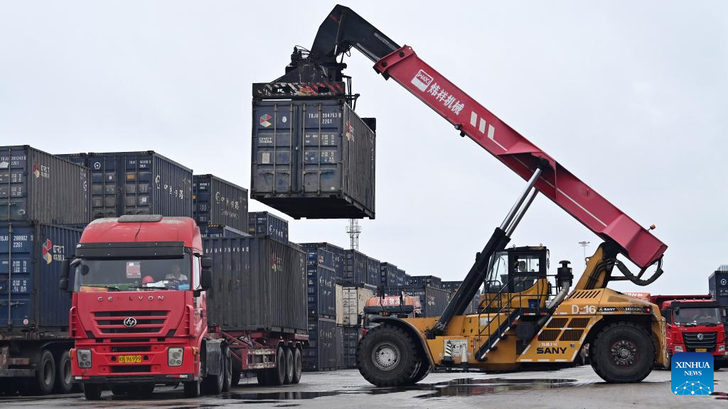 A crane unloads containers at a railway container distribution center in Qinzhou City, south China's Guangxi Zhuang Autonomous Region, May 11, 2023. With boosts from the Regional Comprehensive Economic Partnership (RCEP) and the Belt and Road Initiative (BRI), the New International Land-Sea Trade Corridor saw over 300,000 twenty-foot equivalent units (TEUs), an increase of 14 percent year-on-year, being transported by the rail-sea intermodal freight trains this year. At present, over 940 kinds of goods can be transported through the New International Land-Sea Trade Corridor, which covers 61 cities in China and reaches 393 ports in 119 countries and regions. (Xinhua/Zhang Ailin)