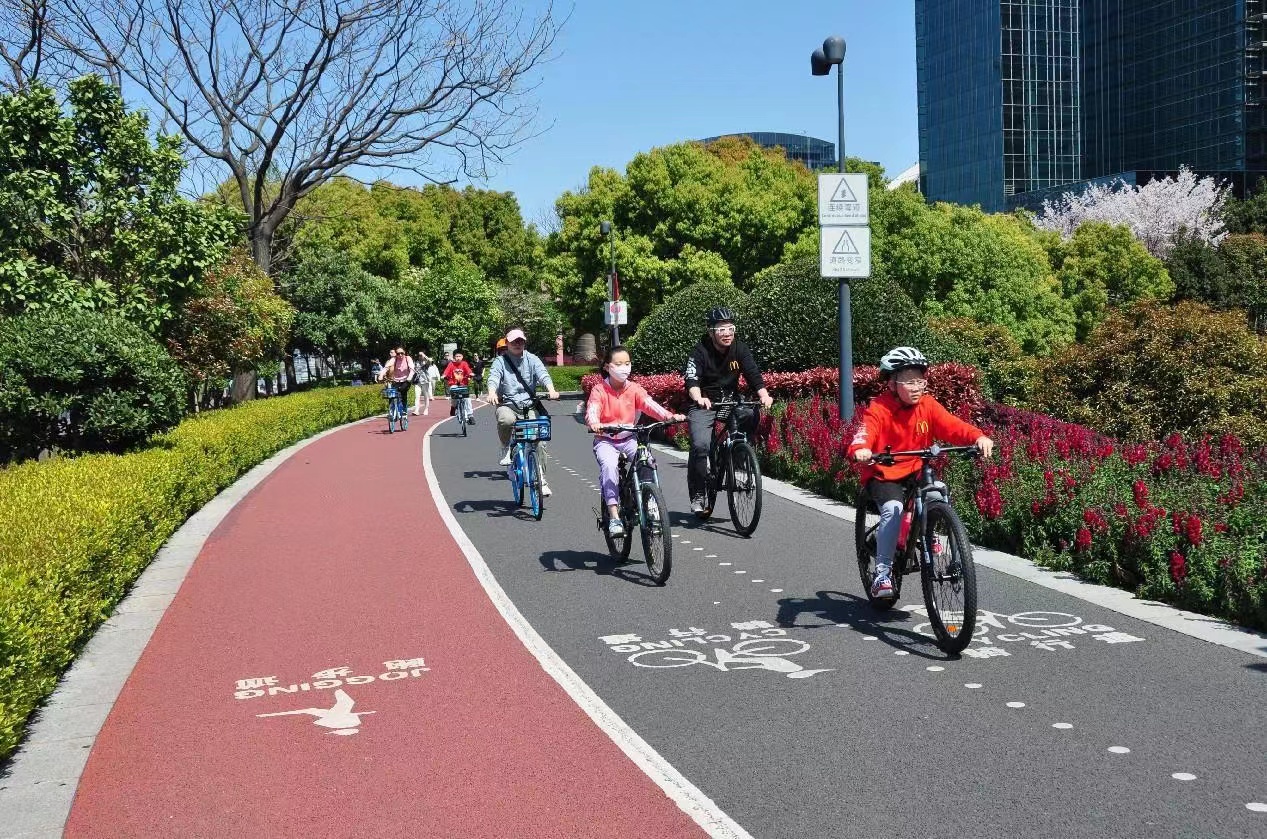 Citizens ride bicycles along a fitness lane Shanghai. (Photo by Yan Daming/People's Daily Online)