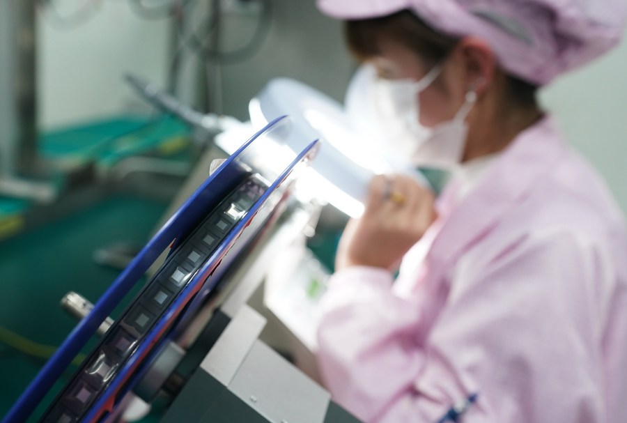 A staff member checks chip products at Nanjing V-Test Semiconductor Technology Co., Ltd. in Pukou Economic Development Zone of Nanjing, east China's Jiangsu Province, March 9, 2023. (Xinhua/Ji Chunpeng)