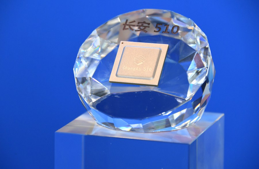 The sample of a high-performance chip dedicated to block chain application is displayed at an exhibition to mark the 2021 National Mass Innovation and Entrepreneurship Week in Beijing, capital of China, Oct. 19, 2021. (Xinhua/Ren Chao)
