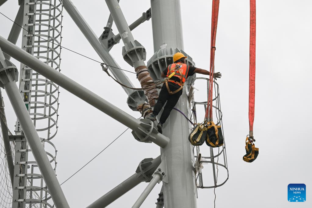 A worker performs tasks at a construction site of the Hainan commercial spacecraft launch site in Wenchang City, south China's Hainan Province, May 13, 2023. (Xinhua/Pu Xiaoxu)