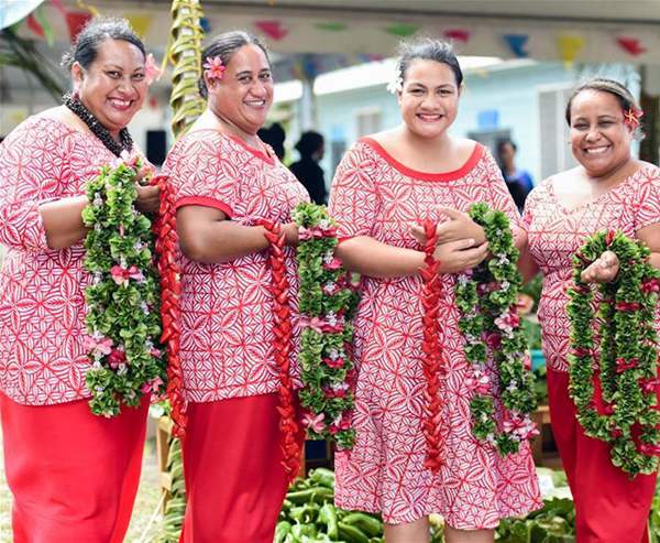 In the Samoan capital of Apia, Samoan women dressed in traditional attire prepare to present floral garlands to guests who have come from afar. (Xinhua/Guo Lei)