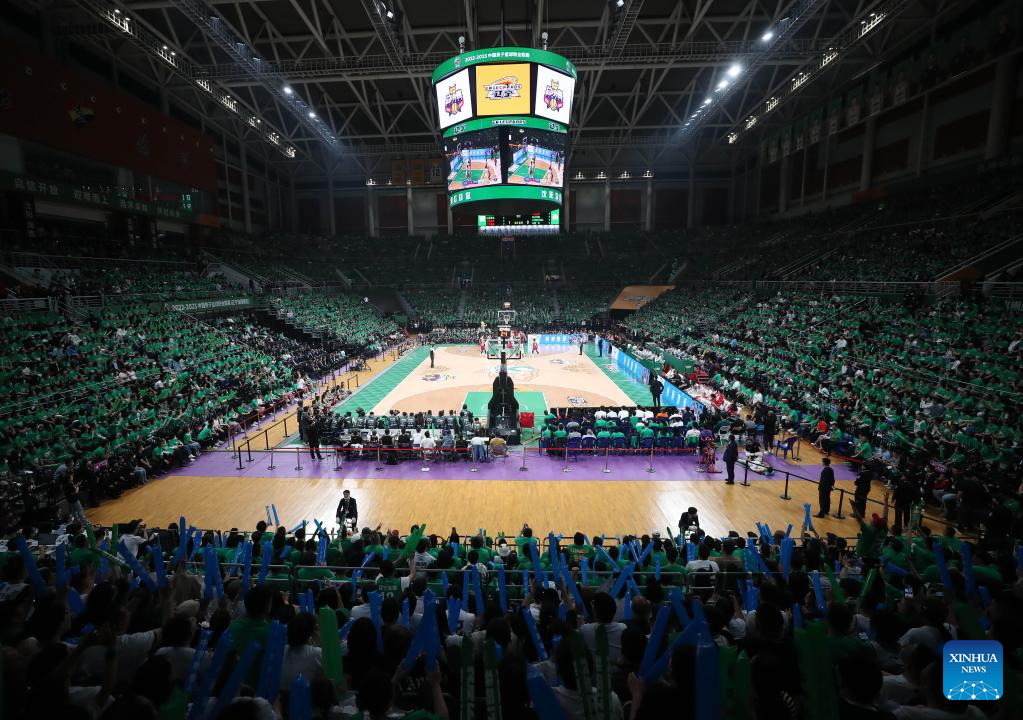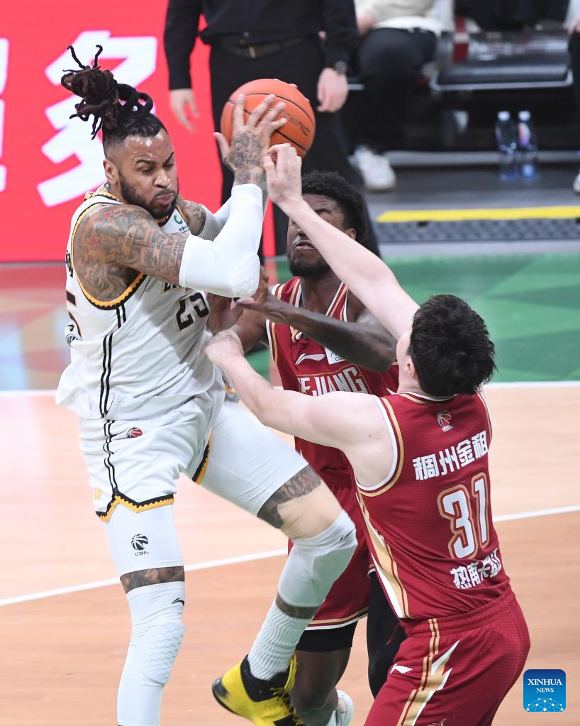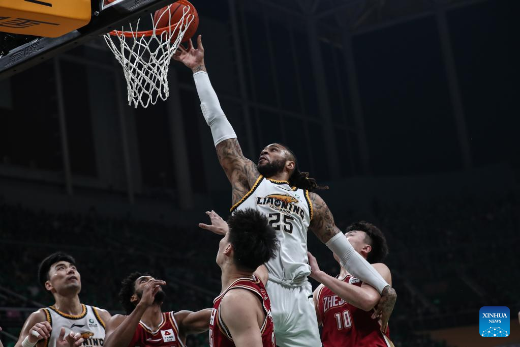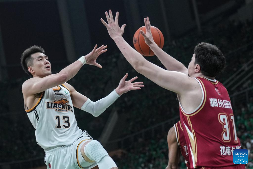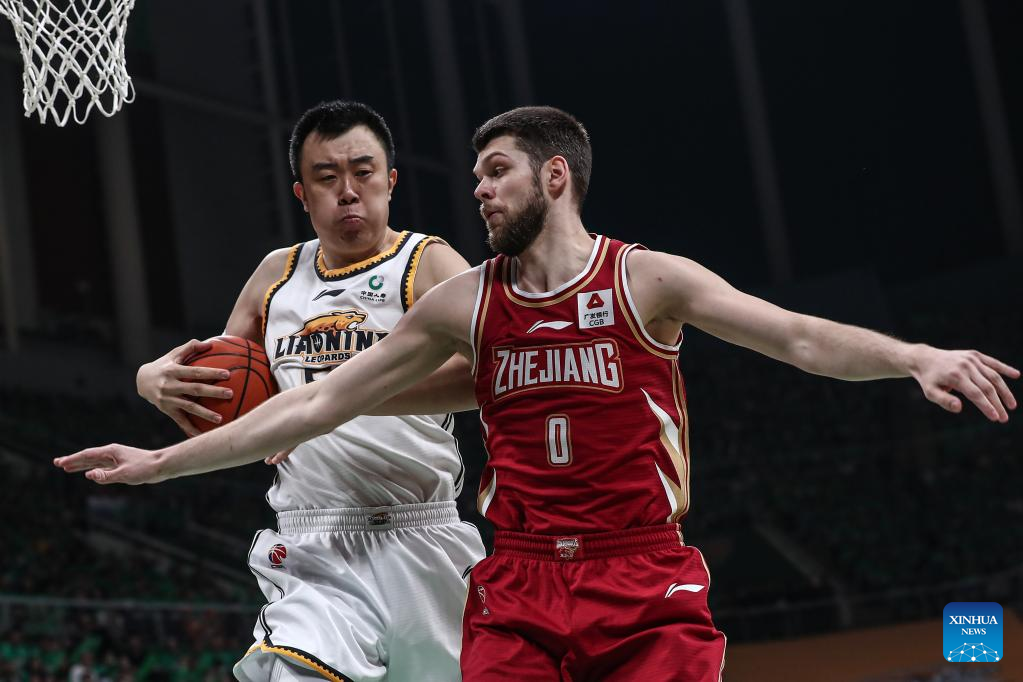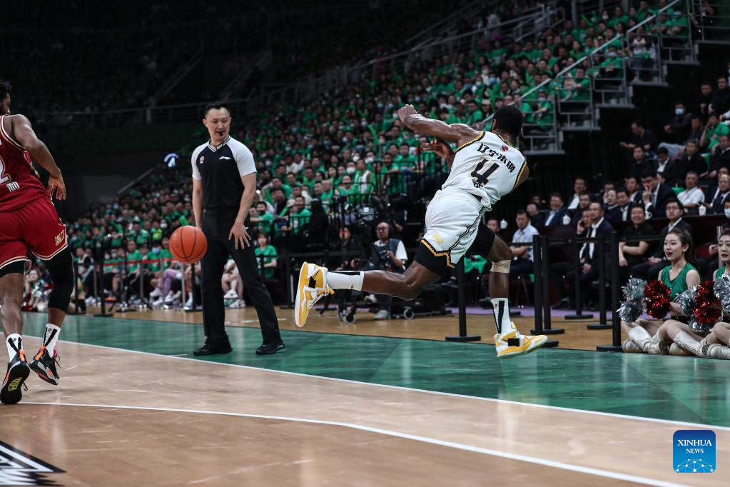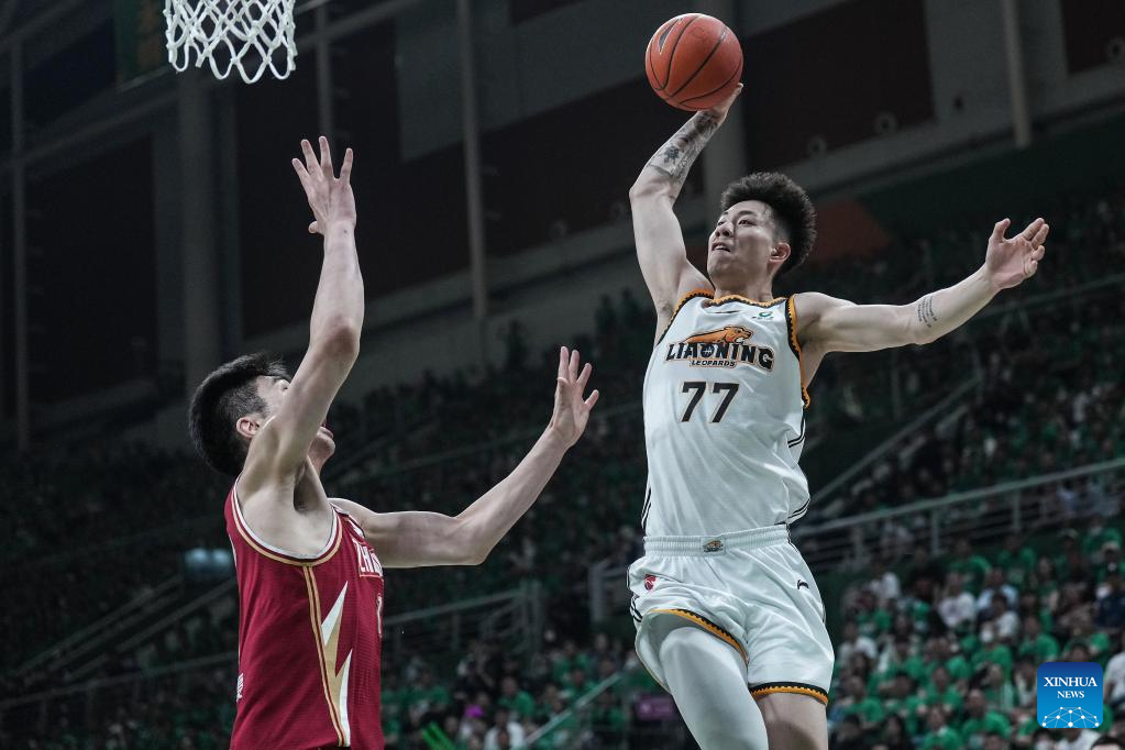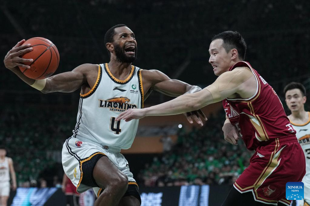 Players compete during the fourth round final match between Liaoning Flying Leopards and Zhejiang Golden Bulls at the Chinese Basketball Association (CBA) league 2022-2023 season playoffs, in Shenyang, north China's Liaoning Province, May 15, 2023. (Xinhua/Long Lei)