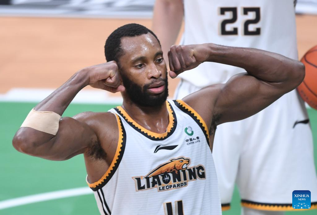 Kyle Fogg of Liaoning Flying Leopards celebrates during the fourth round final match between Liaoning Flying Leopards and Zhejiang Golden Bulls at the Chinese Basketball Association (CBA) league 2022-2023 season playoffs, in Shenyang, north China's Liaoning Province, May 15, 2023. (Xinhua/Long Lei)