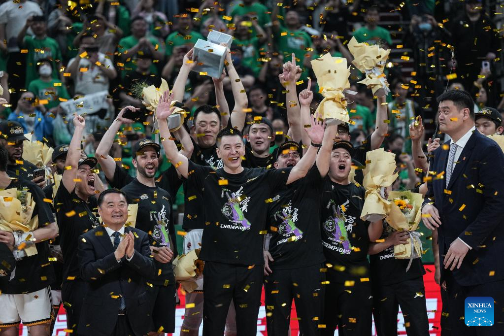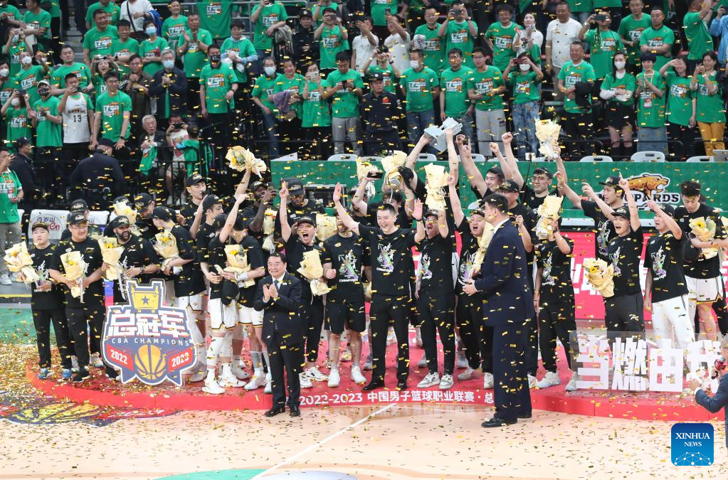 Team members of Liaoning Flying Leopards celebrate on the podium during the awarding ceremony after the fourth round final match between Liaoning Flying Leopards and Zhejiang Golden Bulls at the Chinese Basketball Association (CBA) league 2022-2023 season playoffs, in Shenyang, north China's Liaoning Province, May 15, 2023. (Xinhua/Long Lei)