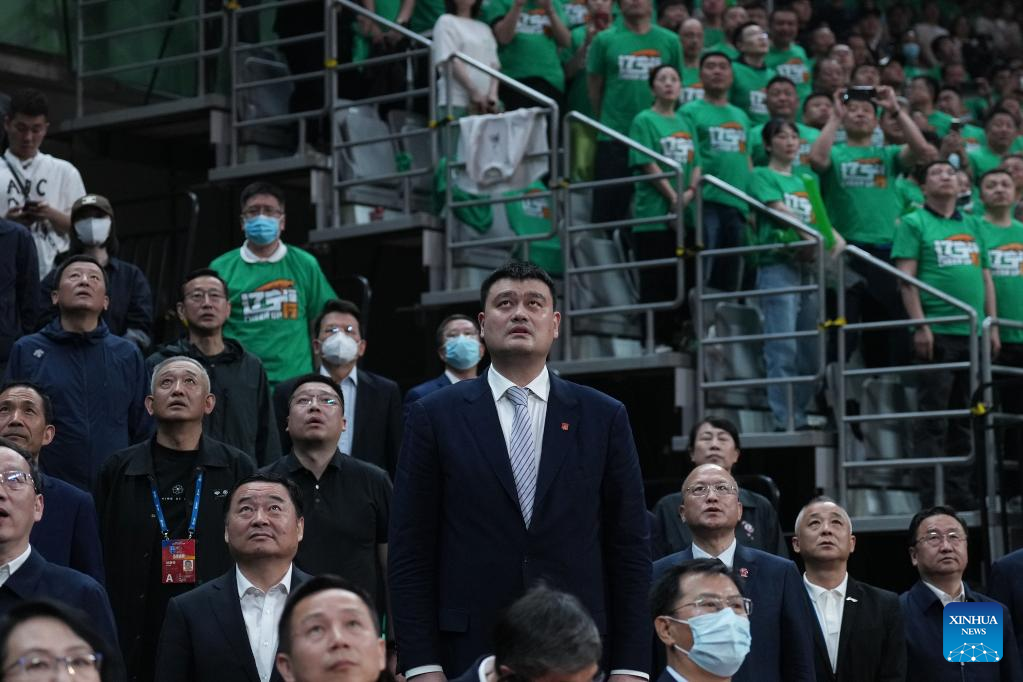 Chinese Basketball Association president Yao Ming is seen before the fourth round final match between Liaoning Flying Leopards and Zhejiang Golden Bulls at the Chinese Basketball Association (CBA) league 2022-2023 season playoffs, in Shenyang, north China's Liaoning Province, May 15, 2023. (Xinhua/Pan Yulong)