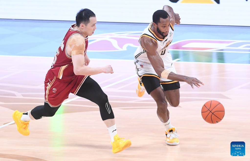 Kyle Fogg (R) of Liaoning Flying Leopards competes during the fourth round final match between Liaoning Flying Leopards and Zhejiang Golden Bulls at the Chinese Basketball Association (CBA) league 2022-2023 season playoffs, in Shenyang, north China's Liaoning Province, May 15, 2023. (Xinhua/Long Lei)
