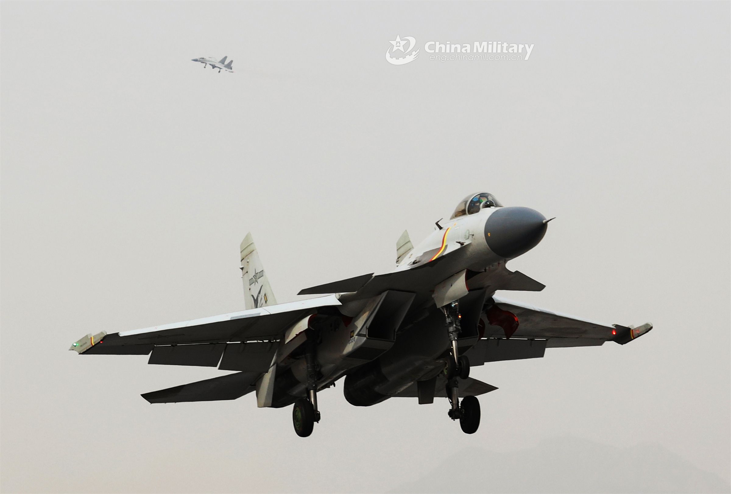 A fighter jet attached to a regiment under the PLA Naval Aviation University begins to descend during the round-the-clock flight training recently. (eng.chinamil.com.cn/Photo by Ni Shuai)