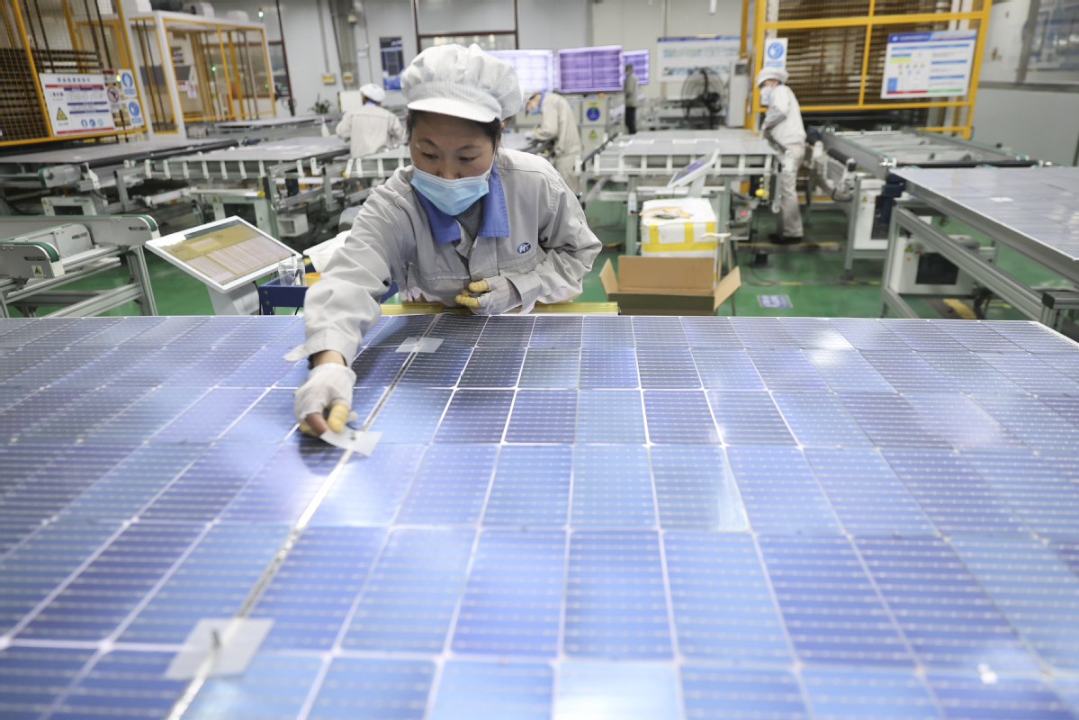 Workers produce solar batteries for export at a photovoltaic enterprise in Lianyungang, Jiangsu province, on Jan 3. [PHOTO by SI WEI/FOR CHINA DAILY]