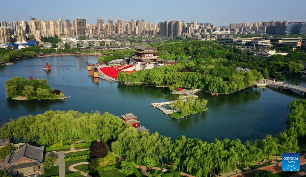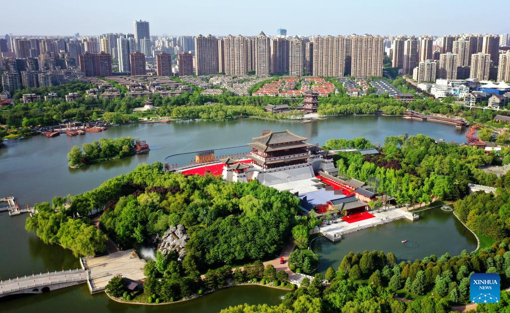 This aerial photo taken on April 25, 2023 shows a view of the Tang Paradise in Xi'an, northwest China's Shaanxi Province. (Xinhua/Liu Xiao)