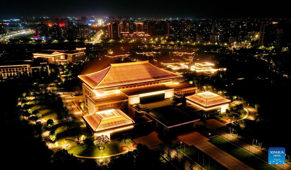 This aerial photo taken on May 1, 2023 shows a night view of the Xi'an international convention center at the Chanba ecological zone in Xi'an, northwest China's Shaanxi Province. (Xinhua/Liu Xiao)
