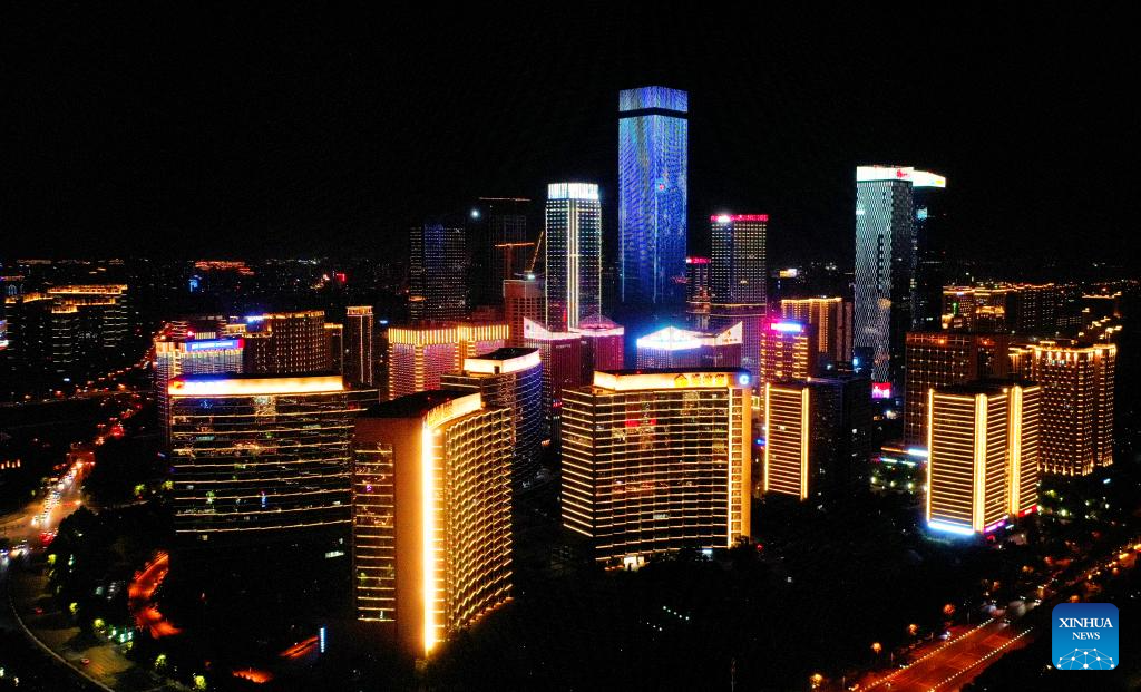This aerial photo taken on April 30, 2023 shows a night view of Xi'an Hi-tech Industries Development Zone in Xi'an, northwest China's Shaanxi Province. (Xinhua/Liu Xiao)