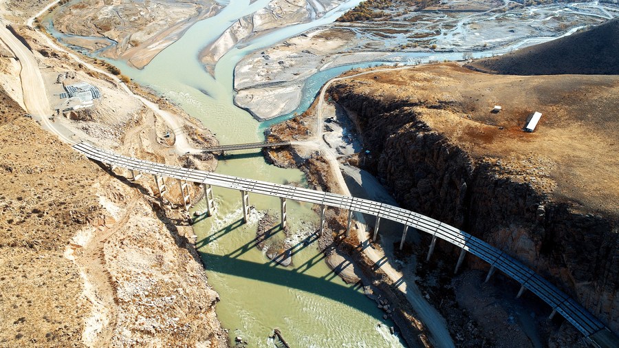 This aerial photo taken on Oct. 27, 2020 shows the construction site of the second phase of the north-south highway in Kyrgyzstan. (China Road &Bridge Corporation/Handout via Xinhua)