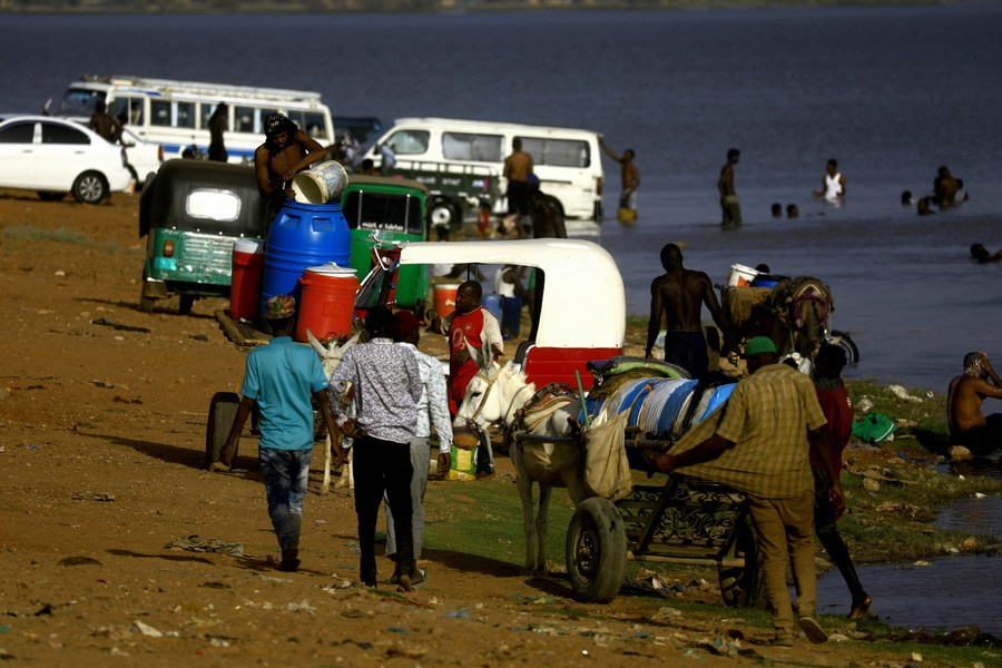 The photo taken on April 17, 2023 shows Sudanese citizens resorting to the Nile to get water after the water and electricity supplies were cut off in their neighborhoods due to the ongoing clashes. (Xinhua/ Mohamed Khidir)