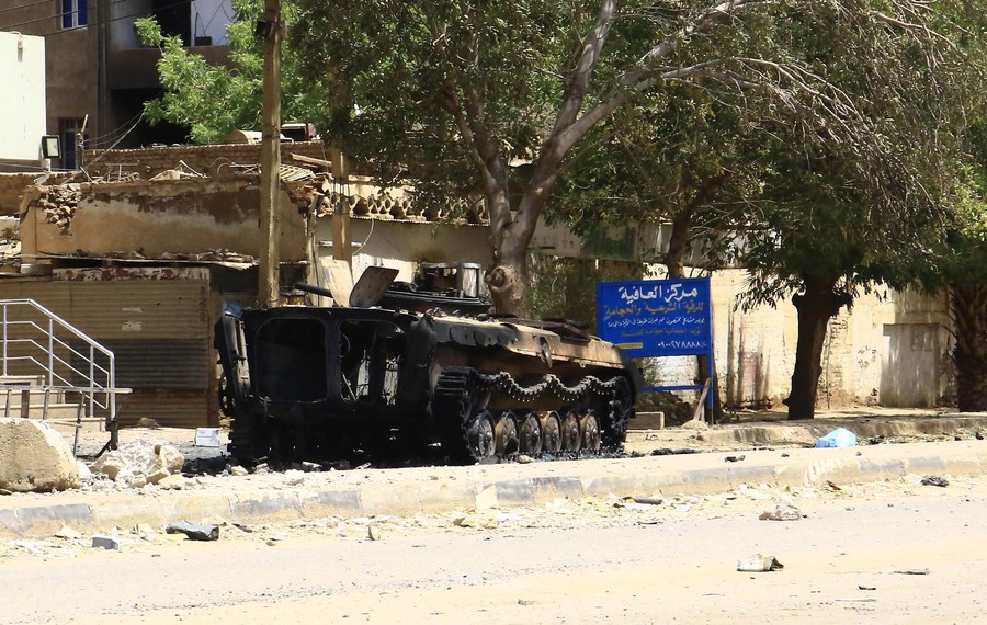 The photo taken on April 18, 2023 shows an armored military vehicle of the Sudanese army damaged in Bahri, north of the Sudanese capital Khartoum. (Xinhua/ Mohamed Khidir)