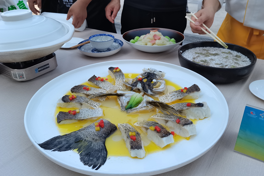 This photo shows a Zhejiang delicacy at a culinary event at Laowaitan, a signature pedestrian street in Ningbo, east China's Zhejiang Province, May 15, 2023. Featuring a long table banquet, the food fiesta brings the participants a public display of delicacies from Central and Eastern European Countries (CEECs) and Zhejiang Province as well. The culinary event, held on the sidelines of the ongoing third China-CEEC Expo &International Consumer Goods Fair, will run until May 18. (Xinhuanet/Zhang Qian)
