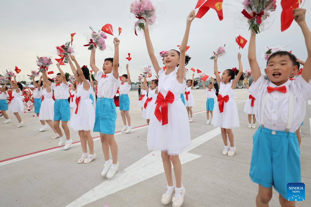 Children welcome the arriving of Kyrgyz President Sadyr Japarov in Xi'an, northwest China's Shaanxi Province, on May 17, 2023. Kyrgyz President Sadyr Japarov arrived in Xi'an, northwest China's Shaanxi Province, late Wednesday afternoon for the China-Central Asia Summit, which is scheduled for May 18 and 19. (Xinhua/Xing Guangli)
