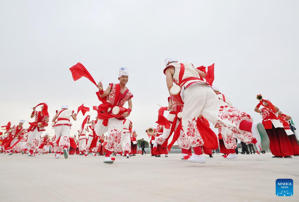 Shaanxi folk dancers perform during a welcoming ceremony for Kyrgyz President Sadyr Japarov in Xi'an, northwest China's Shaanxi Province, on May 17, 2023. Kyrgyz President Sadyr Japarov arrived in Xi'an, northwest China's Shaanxi Province, late Wednesday afternoon for the China-Central Asia Summit, which is scheduled for May 18 and 19. (Xinhua/Xing Guangli)