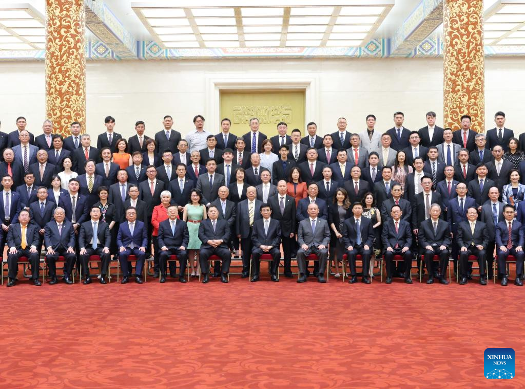 Wang Huning, a member of the Standing Committee of the Political Bureau of the Communist Party of China (CPC) Central Committee and chairman of the National Committee of the Chinese People's Political Consultative Conference, meets with delegates to the sixth members' congress of the Association of Taiwan Investment Enterprises on the Mainland (ATIEM) and takes a group photo with the delegates at the Great Hall of the People in Beijing, capital of China, May 17, 2023. (Xinhua/Wang Ye)