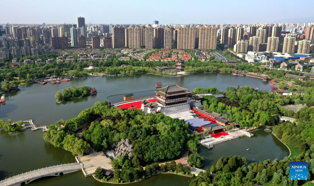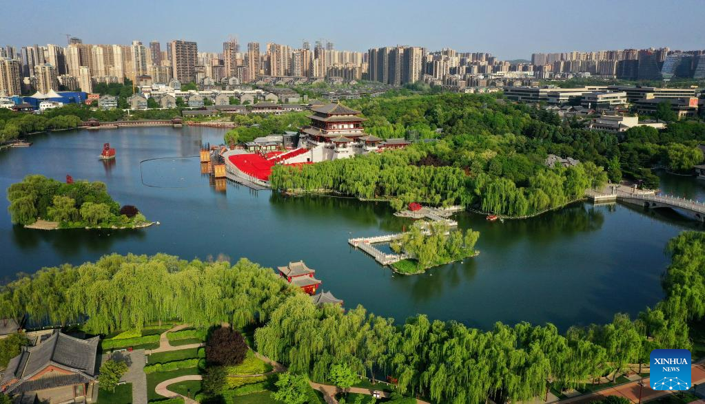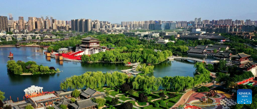 This aerial photo taken on April 25, 2023 shows the view of the Tang Paradise in Xi'an, northwest China's Shaanxi Province. The Tang Paradise, located in the south of Xi'an, is a large cultural theme park showing the life style of the prosperous Tang Dynasty (618-907). (Xinhua/Liu Xiao)