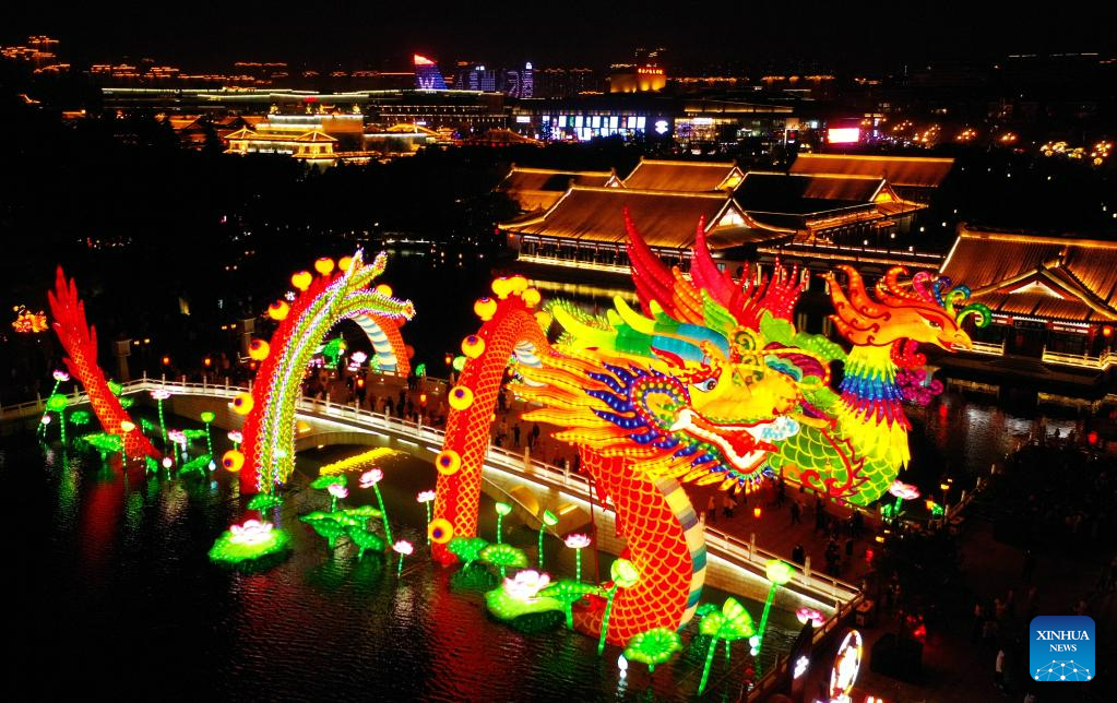 This photo taken on Jan. 24, 2023 shows the night view of the Tang Paradise in Xi'an, northwest China's Shaanxi Province. The Tang Paradise, located in the south of Xi'an, is a large cultural theme park showing the life style of the prosperous Tang Dynasty (618-907). (Xinhua/Liu Xiao)