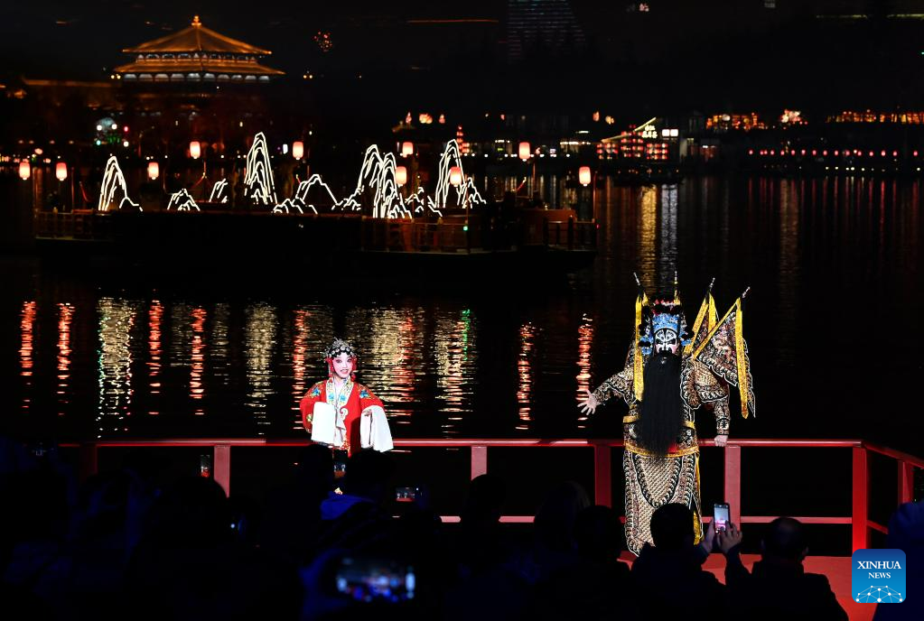 Actors perform Qinqiang Opera at the Tang Paradise in Xi'an, northwest China's Shaanxi Province, Feb. 5, 2023. The Tang Paradise, located in the south of Xi'an, is a large cultural theme park showing the life style of the prosperous Tang Dynasty (618-907). (Xinhua/Liu Xiao)