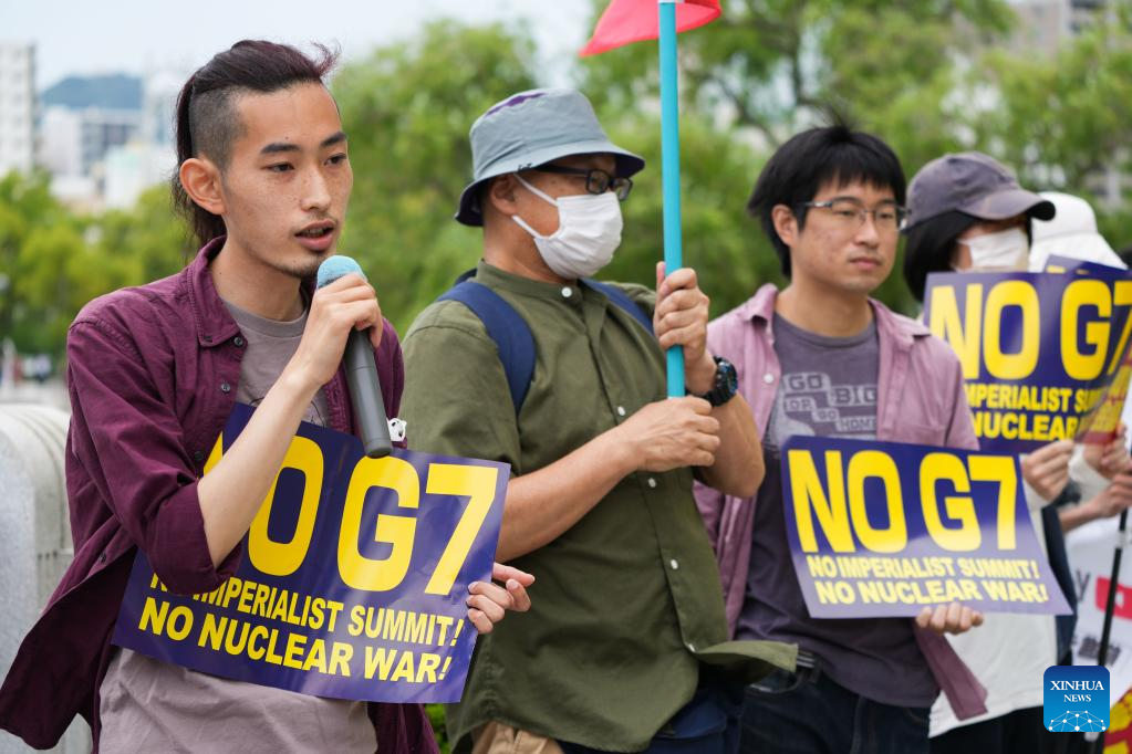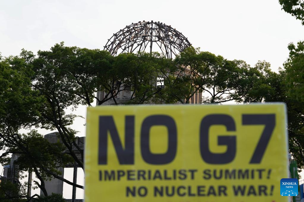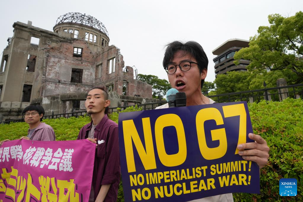 Protesters rally at the Hiroshima Peace Memorial Park in a protest against the upcoming Group of Seven (G7) summit, in Hiroshima, Japan, May 18, 2023. (Xinhua/Zhang Xiaoyu)