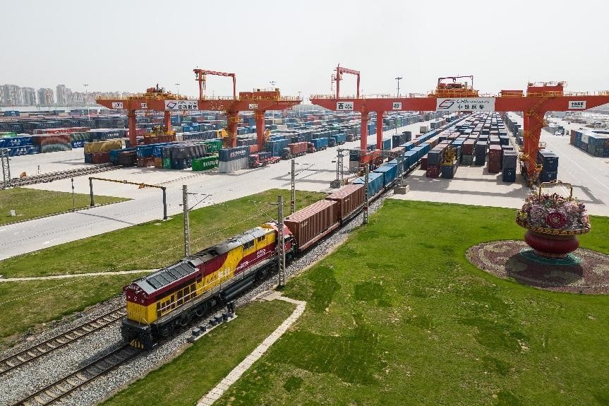 A China-Europe freight train is ready to leave Xi'an, northwest China's Shaanxi province, April 16, 2023. (People's Daily Online/Liu Xiang)