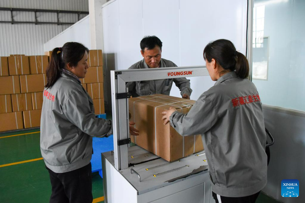 Workers pack sugar stevia leaf products at a factory in Ili Kazak Autonomous Prefecture, northwest China's Xinjiang Uygur Autonomous Region, May 17, 2023. Ili Kazak Autonomous Prefecture has developed flowers sightseeing economy in recent years, which boosts the local tourism, attracts lots of visitors and increases the income of local people. (Xinhua/Ding Lei)