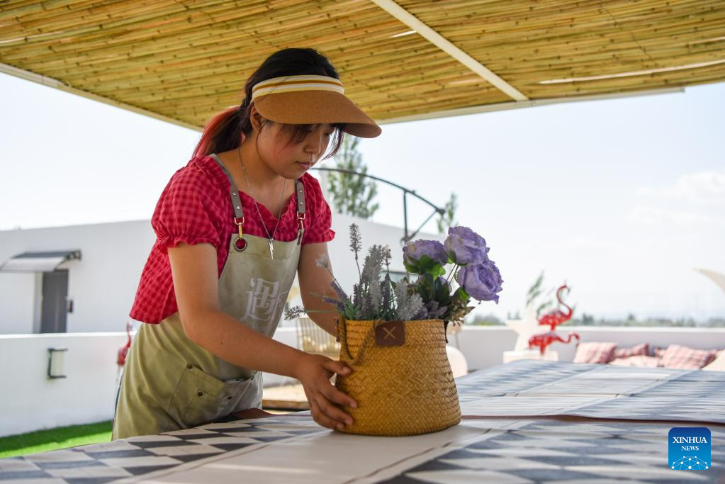 A staff member of a homestay uses a bunch of flowers to decorate a table in Sigong Village, Ili Kazak Autonomous Prefecture, northwest China's Xinjiang Uygur Autonomous Region, May 17, 2023. Ili Kazak Autonomous Prefecture has developed flowers sightseeing economy in recent years, which boosts the local tourism, attracts lots of visitors and increases the income of local people. (Xinhua/Ding Lei)