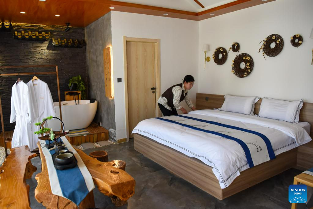 The owner of a homestay makes bed in Taohua Village, Ili Kazak Autonomous Prefecture, northwest China's Xinjiang Uygur Autonomous Region, May 17, 2023. Ili Kazak Autonomous Prefecture has developed flowers sightseeing economy in recent years, which boosts the local tourism, attracts lots of visitors and increases the income of local people. (Xinhua/Ding Lei)