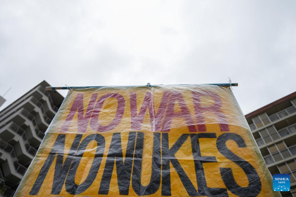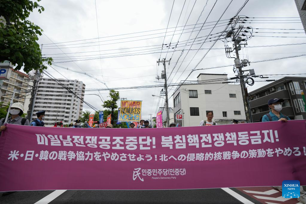 People rally in a protest against the Group of Seven (G7) summit in Hiroshima, Japan, May 19, 2023. Amid waves of protests, the G7 leaders' annual summit got underway in Hiroshima on Friday. (Xinhua/Zhang Xiaoyu)